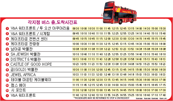 CAPE TOWN EXPLORER ¹ö½º´Â ¿©Çà°¡À̵尡 Á¦°øµÇ´Â ½ÃƼ Åõ¾î ¹ö½º·Î ¾Æ·¡ÀÇ ½ºÄÉÁì¿¡ µû¶ó ¿îÇàÇÑ´Ù. °¡°Ýµµ R180µµ ºñ±³Àû ÀÚ·ÅÇÑ ºñ¿ëÀ¸·Î Å×ÀÌºí¸¶¿îƾ »Ó¸¸ ¾Æ´Ï¶ó ÄÉÀÌÇÁŸ¿î ½Ã³» ÁÖº¯Áö¿ªÀ» µÑ·¯ º¼ ¼ö ÀÖ´Ù.